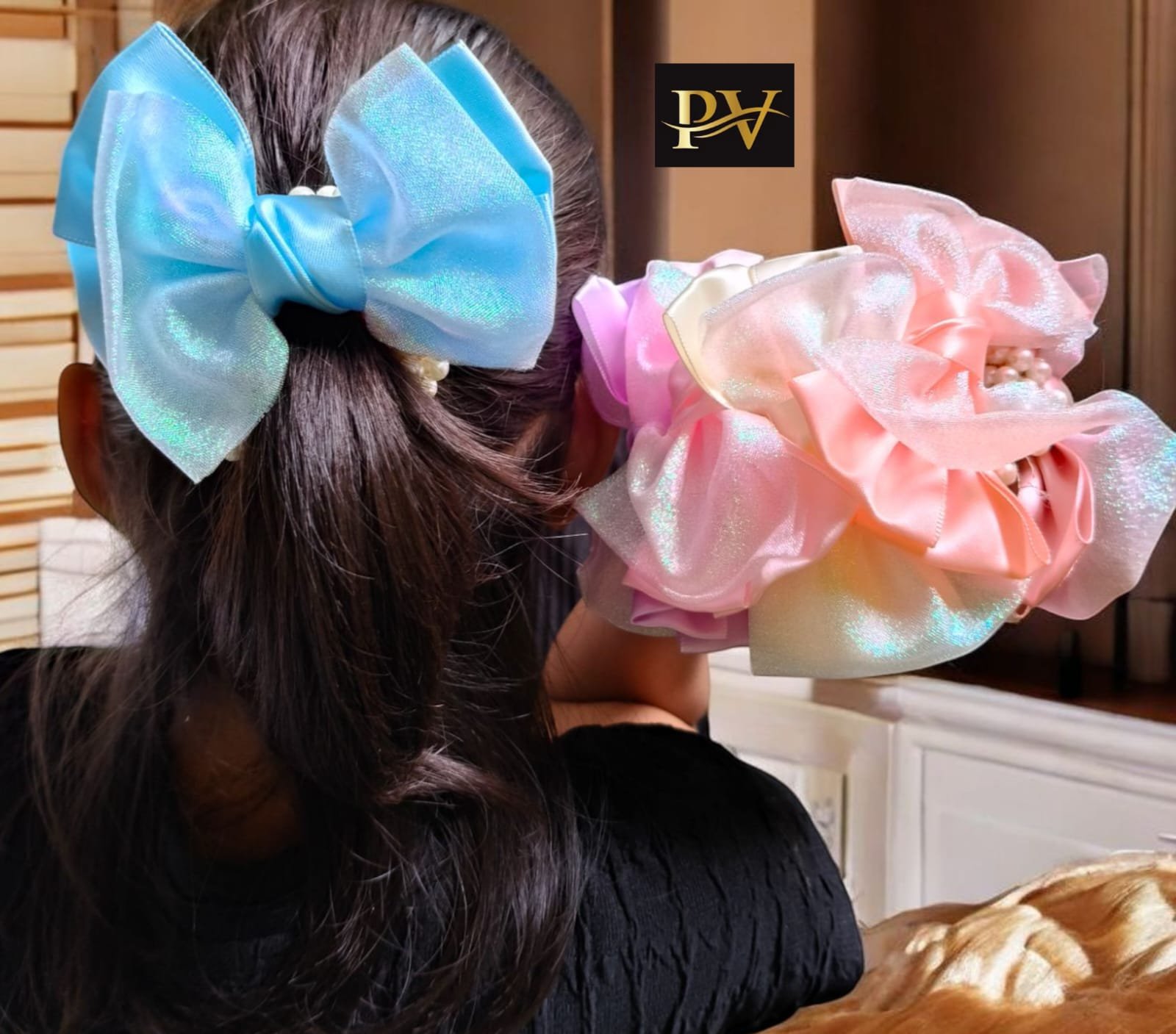 "Holographic 2-Layer Bow Moti Rubber Bands" Add a holographic touch to your style! Available in 6 vibrant colors Perfect for adding a pop of color to your children's hair Accessories!